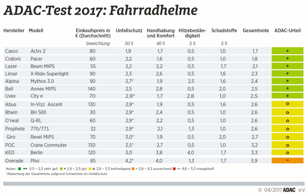 Insgesamt wurden Testnoten von 1,7 (gut) bis 3,9 (ausreichend) vergeben. Teilweise haben Fahrradhelme bei der Hitzebeständigkeit mit einer 4,0 (ausreichend) abgeschlossen. Quelle: ADAC e.V. – Infografik – Übertragungsfehler nicht ausgeschlossen, alle Angaben ohne Gewähr. Den Testsieger (’21) für Fahrradhelme für Erwachsene gibt es aktuell für 73,95 €, der Uvex City i-vo MIPS belegt dabei den Spitzenplatz, gefolgt vom Alpina Haga LED. Quelle der Bewertung: ADAC e.V. – Infografik – Übertragungsfehler nicht ausgeschlossen, alle Angaben ohne Gewähr.